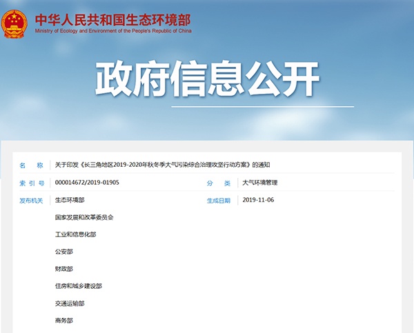 2019年11月6日,生態(tài)環(huán)境部聯(lián)合國家發(fā)展和改革委員會(huì)、工業(yè)和信息化部、公安部、財(cái)政部、住房和城鄉(xiāng)建設(shè)部等發(fā)布關(guān)于印發(fā)《長三角地區(qū)2019-2020年秋冬季大氣污染綜合治理攻堅(jiān)行動(dòng)方案》的通知,詳情如下: