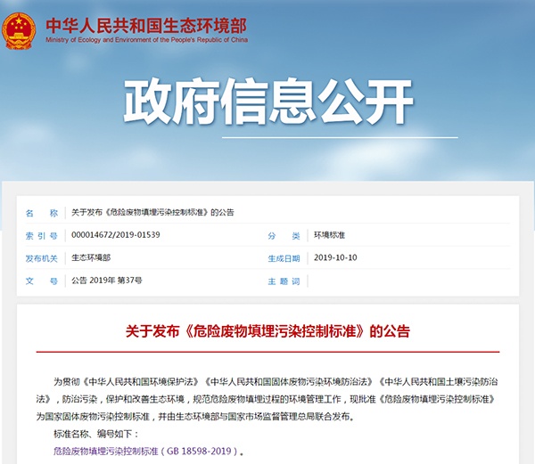 2019年10月10日,生態環境部發布了《危險廢物填埋污染控制標準》,詳情如下: