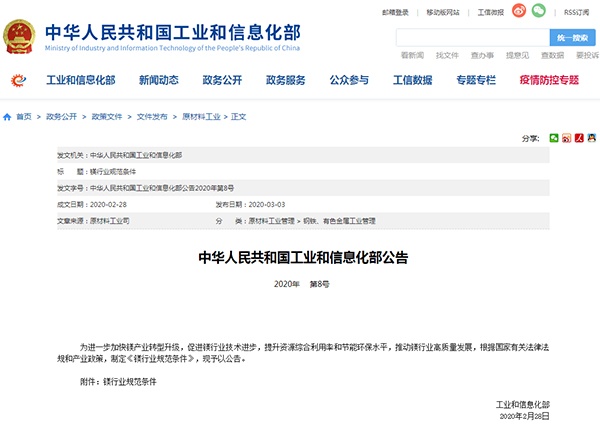 2020年3月3日,工業和信息化部發布了《鎂行業規范條件》,詳情如下: