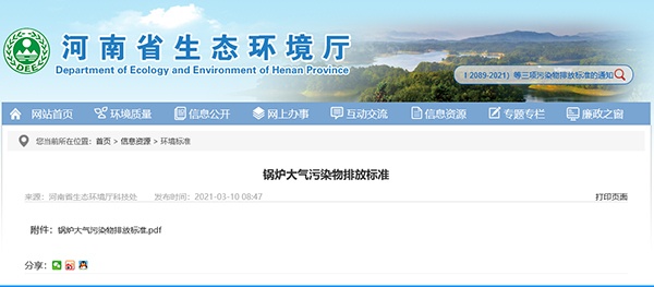 河南省《鍋爐大氣污染物排放標準》(DB41/2089-2021)已經省政府同意,并于2021年1月20日由省生態環境廳、省市場監督管理局聯合發布,2021年3月1日起實施。