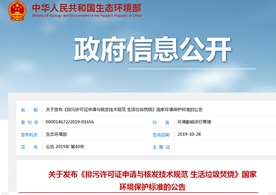 2019年10月28日,生態環境部發布了關于發布《排污許可證申請與核發技術規范 生活垃圾焚燒》國家環境保護標準的公告